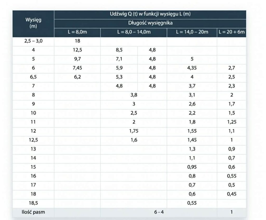 Tabela udźwigów żurawia Jelcz 6×6 18 TON DST – 0184